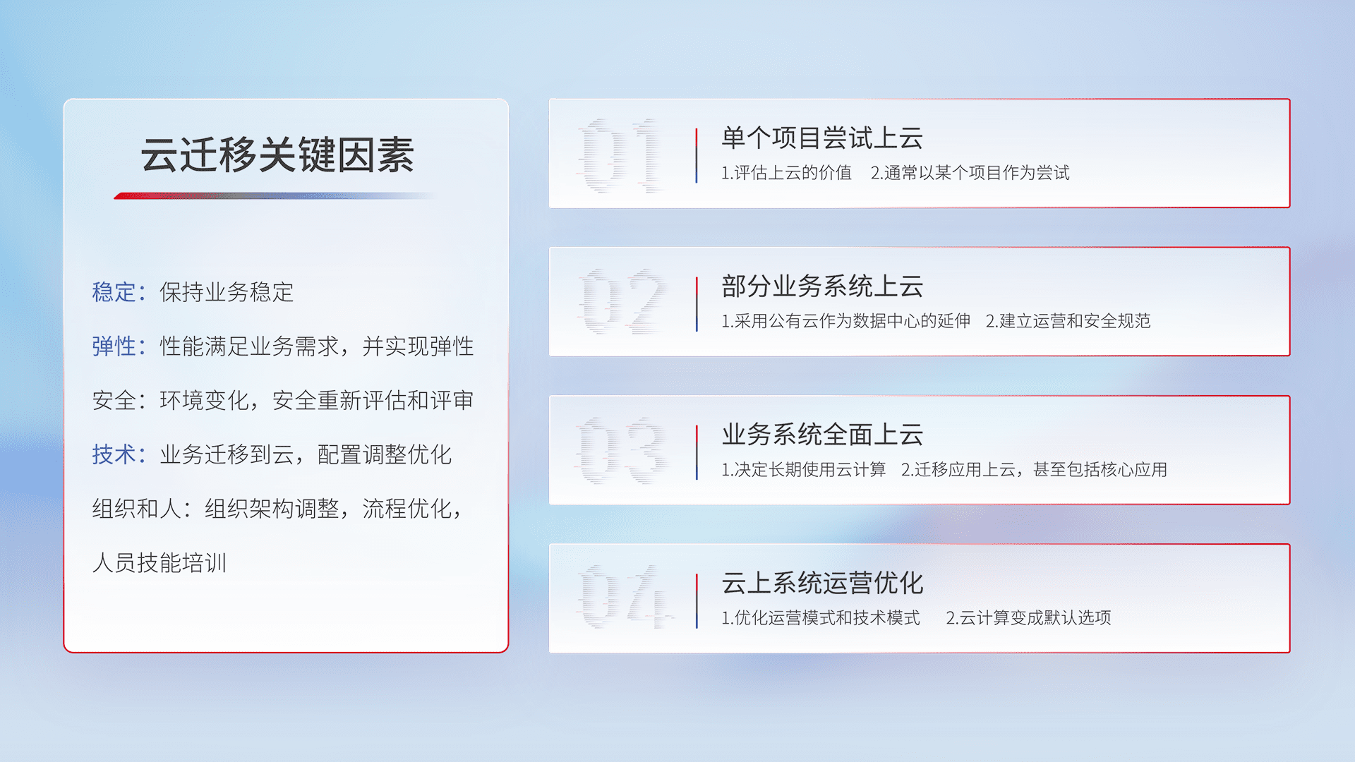 结合实际业务,,,,从规划设计、、、云平台选型、、、云原生改造、、、数据迁移、、、、集成交付,,,,迁移全过程为客户识别最佳上云路径,,做好风险识别管理,,,,设计网络架构、、、、身份权限、、、安全审计合规、、、操作审计、、、、日志审计、、、监控告警策略、、多站点容灾设计等,,对云上基础设施进行整体规划,,,提升IT治理水平,,,以满足弹性、、高可用、、、高性能的需求。。