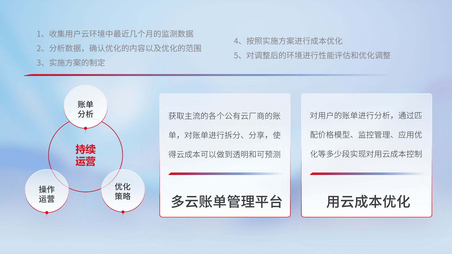 通过多云纳管,,,以统一的资源数据模型把客户的云资源进行抽象和封装,,,,进而实现对多云资源的统一操作,,,保障云资源管理的可靠性、、、、稳定性与可用性。。量身定制化运维内容,,,配置、、、开发运维、、、补丁管理、、、备份、、、监控、、认证和访问管理、、、、审计和日常巡检等,,保障在用云过程中的可靠度,,稳定度以及高可用率。。。。